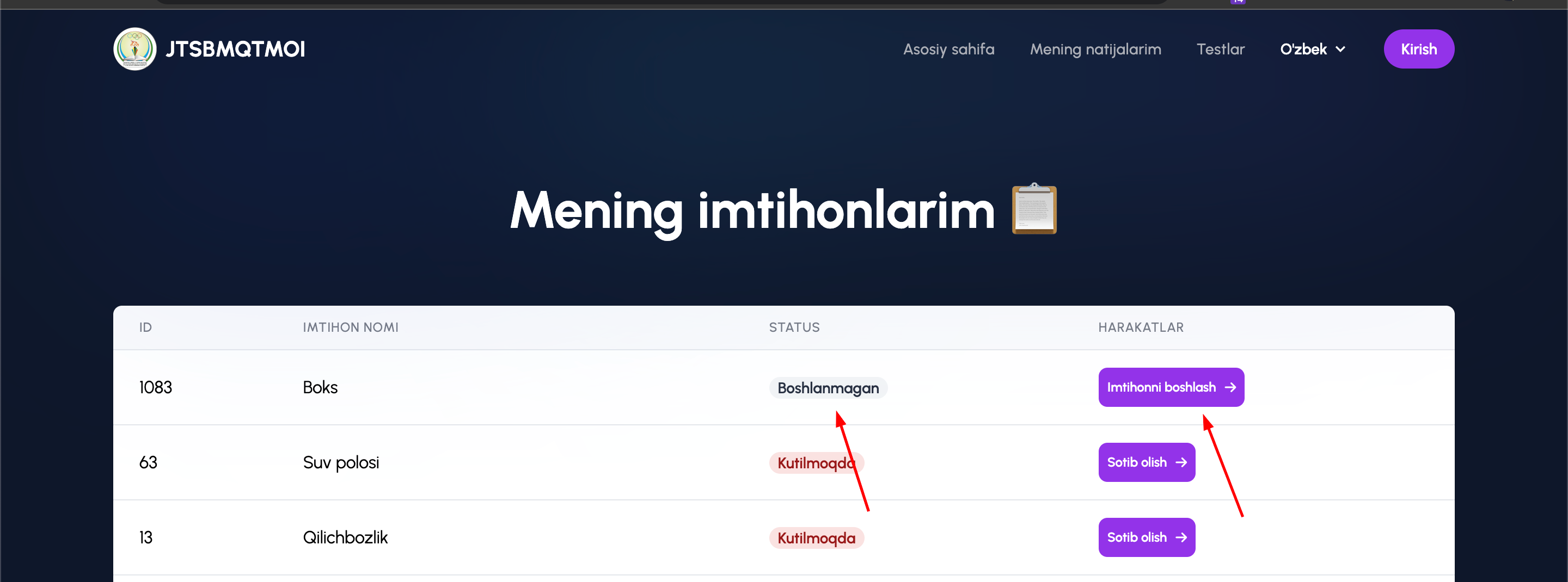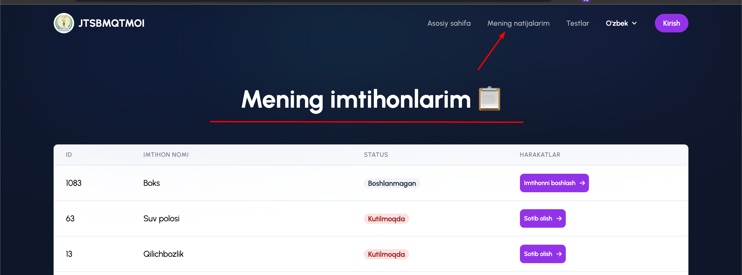 2. To'lov tizimidan qaytganingizda sizga "Mening imtihonlarim" bo'limi ochiladi