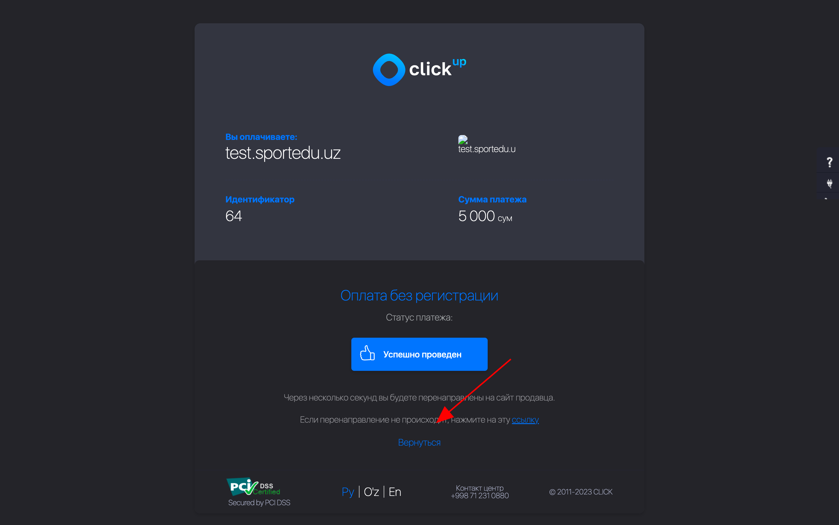 1. To'lov qilib bo'lganingizdan so'ng siz to'lov tizimidan bizning tizimga qaytishingiz kerak